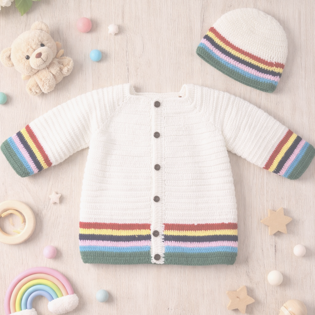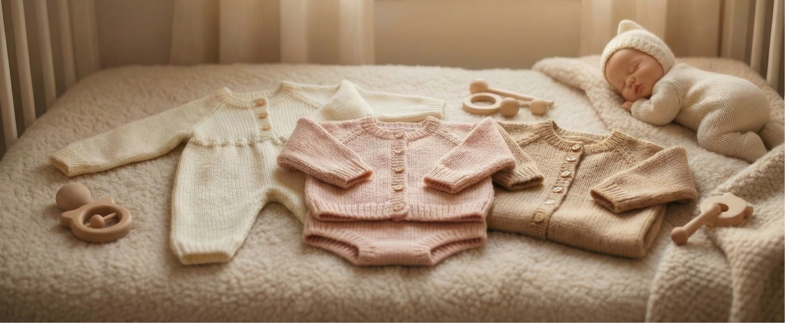 Hand-Knitted baby outfits, cozy hats and adorable booties - created with care, softness, and love.